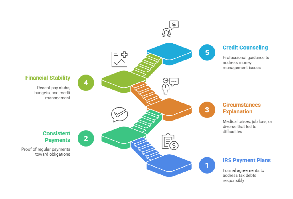 | Financial problems | Payment plan agreements, proof of payments, credit counseling certificates | Shows proactive resolution efforts rather than ignoring debts |