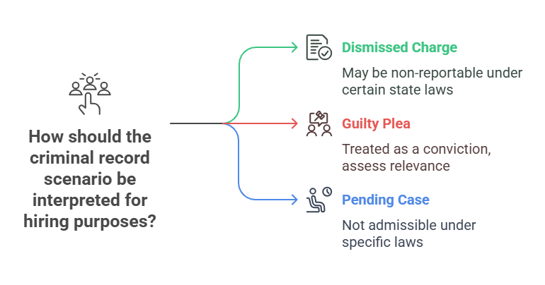 Hiring Implication: Treated as conviction - assess nature/time/relevance per EEOC guidance - Pending Case (No Disposition) + Bail Conditions