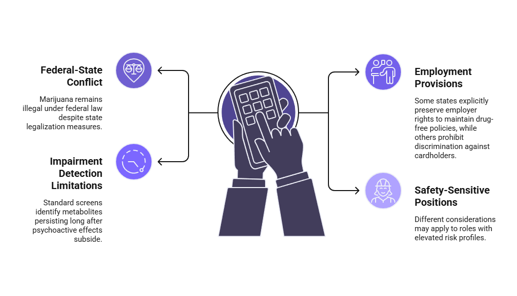 • Legal considerations include state-specific cannabis policies, prescription medication protections, and federal workplace drug-free requirements.