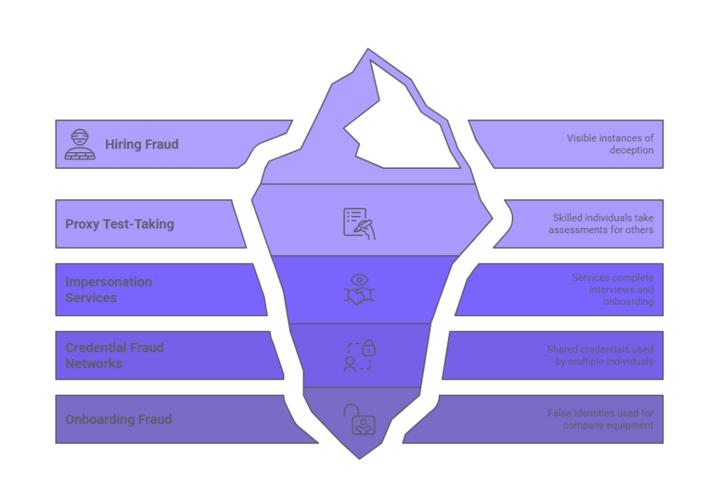 - Proxy test-taking: Candidates hire technically skilled individuals to complete online skills assessments or certification exams. This occurs particularly for specialized technical roles where assessment performance significantly influences hiring decisions.
