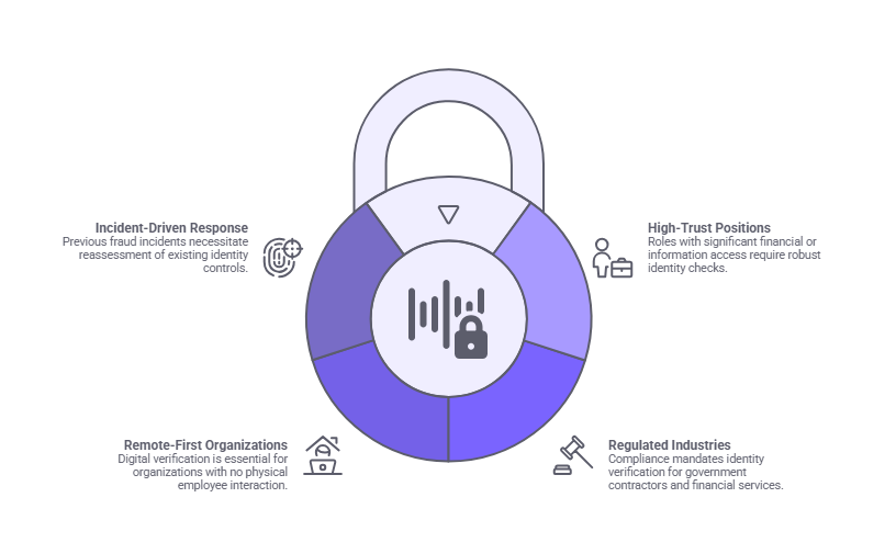- Remote-first organizations: Identity assurance relies entirely on digital verification methods when organizations never meet employees physically.