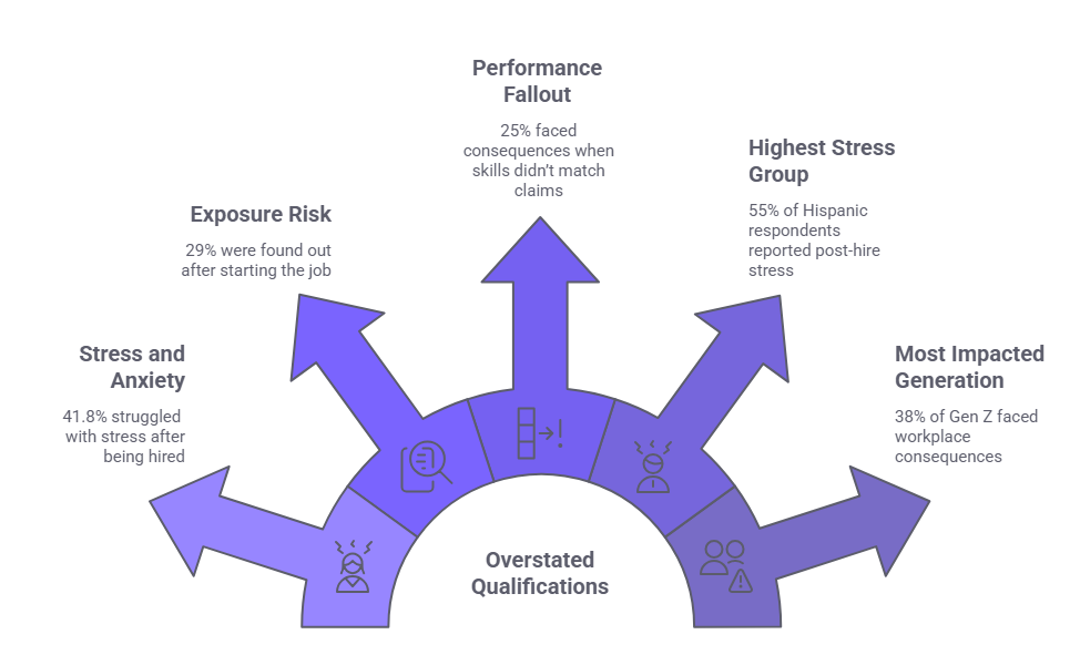 According to the 2026 survey, 41.8% of the dissonant majority experienced stress or anxiety after employers hired them on the basis of overstated qualifications. Additionally, 29% said their overstatement became apparent on the job, and 25% faced negative workplace consequences because their skills did not match their resume. Hispanic respondents reported the highest post-hire stress rate at 55%, and Gen Z faced the highest rate of negative workplace consequences at 38%.
