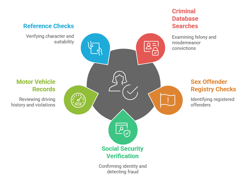- Criminal Database Searches: County, state, and national records examining felony and misdemeanor convictions from relevant jurisdictions.