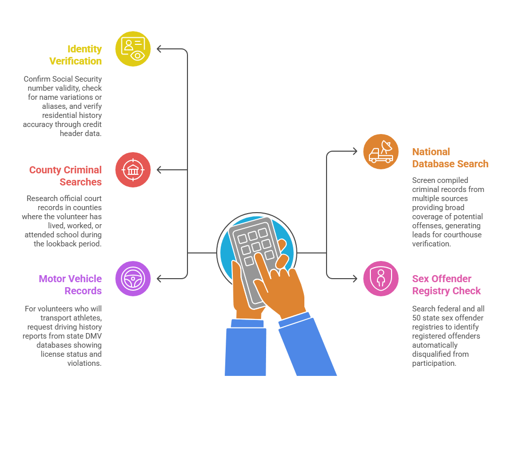 Standard youth sports volunteer background checks incorporate several distinct search types that together provide comprehensive risk assessment. The screening process typically includes these essential components: