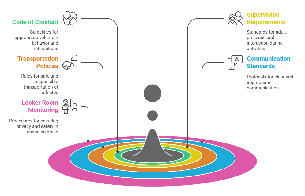 - Supervision Requirements: Standards requiring multiple adults present during practices and games, prohibited one-on-one contact in isolated locations, procedures for necessary individual discussions, and parent observation rights.